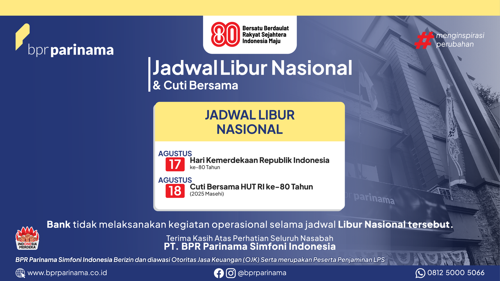 tentang Hari Libur Nasional Tahun 2025. Dengan ini kami bermasuk mengabarkan kepada seluruh Nasabah kami bahwa kantor kami, PT BPR Parinama Simfoni Indonesia akan tutup sementara pada tanggal 18 Agustus 2025. Penutupan ini bertujuan untuk memberikan momen spesial para Nasabah dan keluarga dalam kegiatan Hari Kemerdekaan Republik Indonesia ke-80 Tahun untuk seluruh warga Negara Republik Indonesia sebagai hari bersejarah di negara kita, Negara Indonesia tercinta ini.